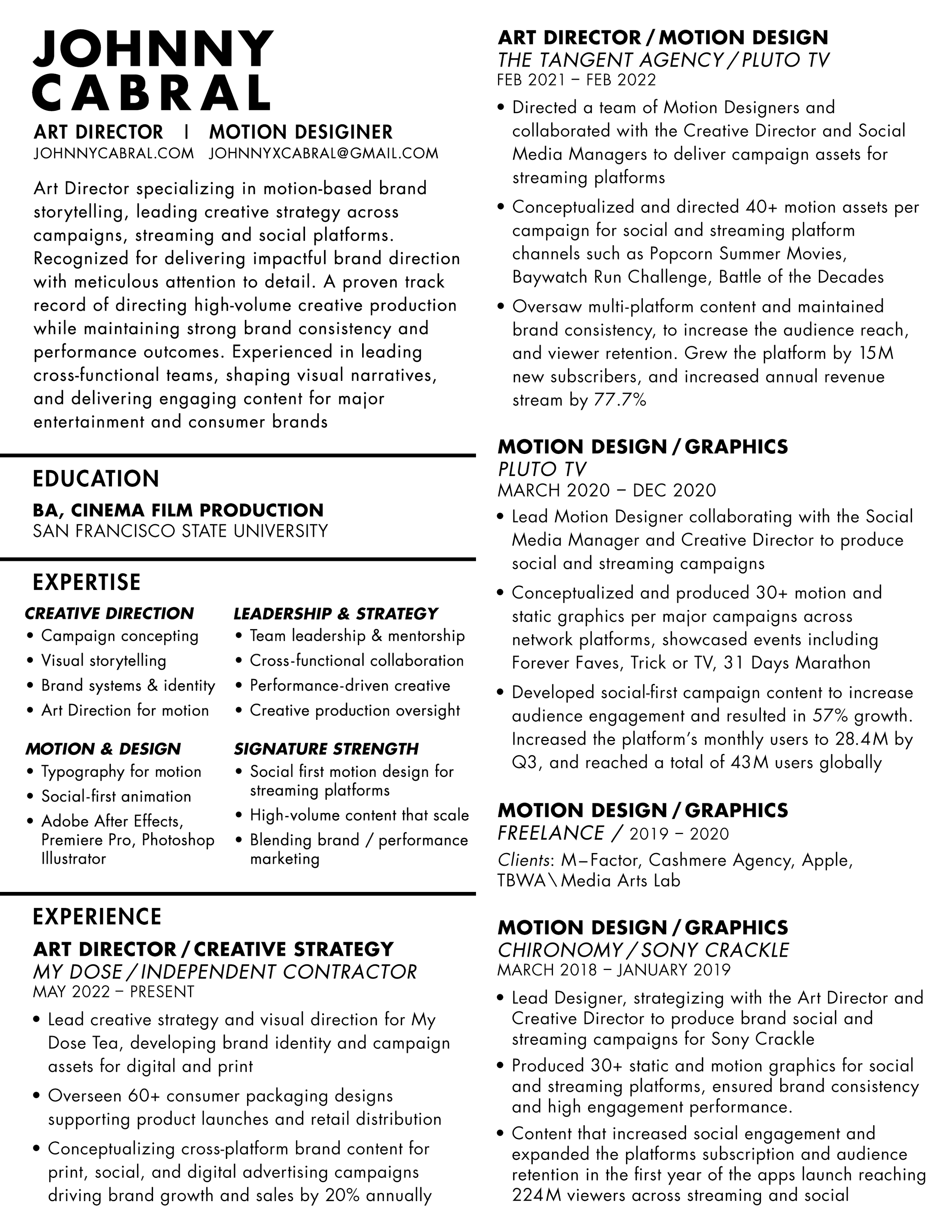 I’m a passionate and driven visual artist with extensive experience in the advertising industry as an Art Director, and Motion Graphics designer. I enjoy leading creative teams from initial concept through final execution, turning ideas into thoughtful, impactful visual work. Known for my attention to detail and collaborative approach, I value building strong partnerships and creating an environment where great ideas can thrive. Whether working with major studios or boutique agencies, I’m committed to delivering meaningful, engaging work that exceeds expectations and resonates with audiences.